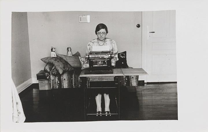 Illustrierte Postkarte; Fotografie, monochrom Rückseite: Frau mit Brille und Schreibmaschine in einem Zimmer Vorderseite nicht beschrieben
