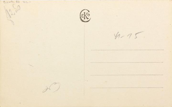 Illustrierte Postkarte; Fotografie, koloriert; Serie Ceko 1819 Rückseite: Frau mit Schreibmaschine, Blick zum Betrachter, Blumen als Dekoration Vorderseite nicht beschrieben
