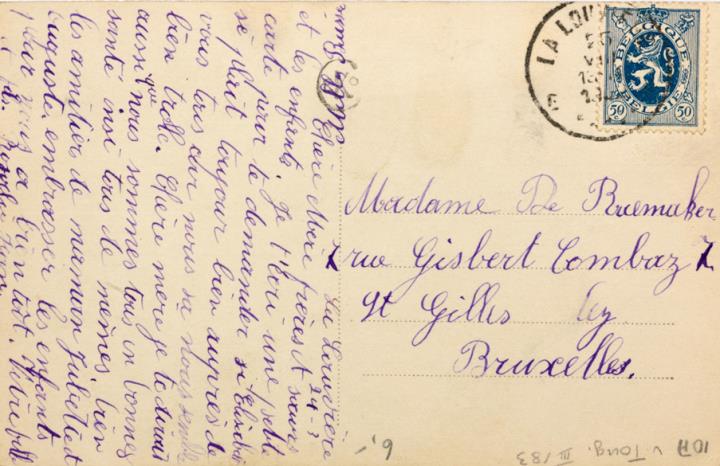 Illustrierte Postkarte; Fotografie, koloriert; Serie Ceko 1819 Rückseite: Frau mit Schreibmaschine, Blumen als Dekoration Vorderseite: beschrieben; adressiert an Madame De Baemaker, Bruxelles; Briefmarke Postes Belgique 50c; Poststempel unleserlich