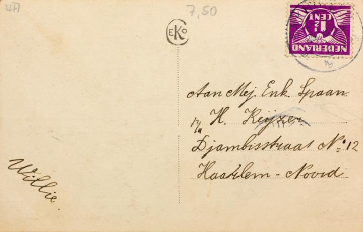 Illustrierte Postkarte; Fotografie, koloriert; Serie Ceko 1820 Rückseite: Frau mit Schreibmaschine, Blick zum Betrachter, Blumen als Dekoration Vorderseite: beschrieben; adressiert an Mej. Spaan, Haarlem Nord; Briefmarke Nederland 1 1/2 Cent; Poststempel unleserlich