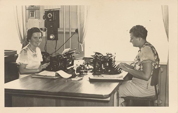 Illustrierte Postkarte; Fotografie, monochrom Rückseite: zwei Sekretärinnen mit Schreibmaschine in einem Büro, an der Wand hängend Werbekalender Silenta Vorderseite nicht beschrieben