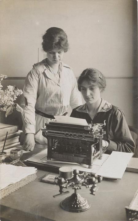 Illustrierte Postkarte; Fotografie, monochrom Rückseite: Sekretärin mit Schreibmaschine Underwood und weitere Mitarbeiterin in einem Büro Vorderseite mit handschriftlichem Vermerk: ca. 1920