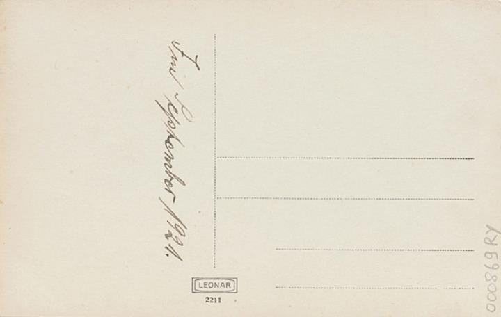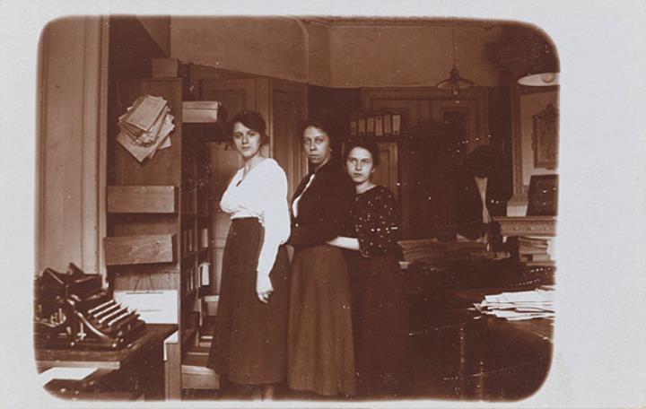 Illustrierte Postkarte; Fotografie, monochrom Rückseite: drei Büromitarbeiterinnen posieren für ein Gruppenbild, Seitentisch mit Schreibmaschine Vorderseite mit handschriftlichem Vermerk: Im September 1921