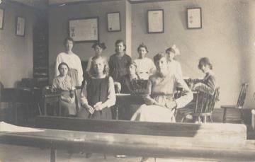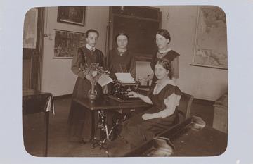Illustrierte Postkarte; Fotografie, monochrom Rückseite: Gruppenbild mit jungen Frauen in einem Unterrichts- oder Arbeitszimmer, Tisch mit Schreibmaschine Vorderseite nicht beschrieben