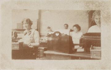 Illustrierte Postkarte; Fotografie, monochrom Rückseite: sechs Büromitarbeiterinnen (eine mit Schreibmaschine) posieren für ein Gruppenbild Vorderseite beschrieben (1919)