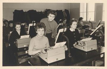 Illustrierte Postkarte; Fotografie, monochrom Rückseite: Unterrichtsraum mit jungen Frauen beim Maschinenschreiben Vorderseite nicht beschrieben