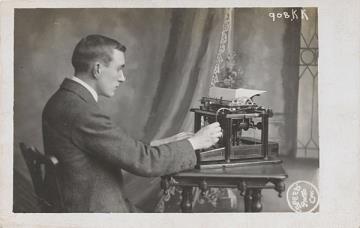 Illustrierte Postkarte; Fotografie, monochrom; Speed Photo Cor. Nr. 908 K.K. Rückseite: Mann mit Schreibmaschine Vorderseite nicht beschrieben