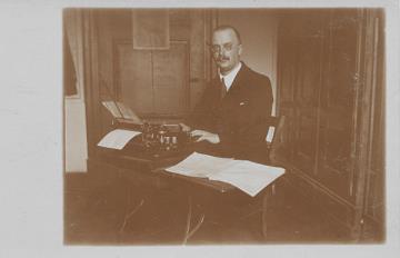 Illustrierte Postkarte; Fotografie, monochrom Rückseite: Mann mit Schreibmaschine Oliver in einem Büro Vorderseite beschrieben: A.G. Hahn 1924