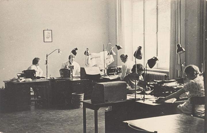 Illustrierte Postkarte; Fotografie, monochrom Rückseite: Büroansicht; Mitarbeiterinnen an Schreibtischen mit Tischlampe und Schreibmaschine