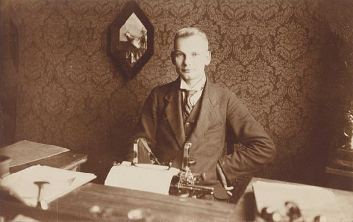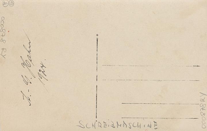 Illustrierte Postkarte; Fotografie, monochrom Rückseite: Mann mit Schreibmaschine Oliver in einem Büro Vorderseite beschrieben: A.G. Hahn 1924