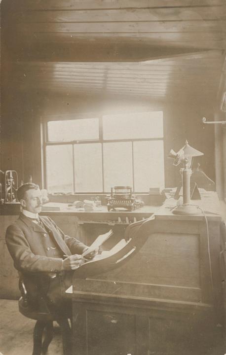Illustrierte Postkarte; Fotografie, monochrom Rückseite: Mann in einem Büro mit Schreibmaschine Salter und Telefon Vorderseite nicht beschrieben