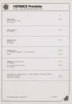 3 Preislisten für Schreibmaschine Hermes: elektrische Schreibmaschinen, Stand 01.03.1981 mechanische Schreibmaschinen, Stand 01.05.1981 Reise- und Kofferschreibmaschinen, Stand 15.06.1981