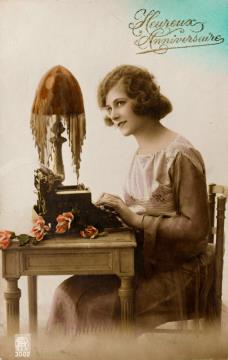 Illustrierte Postkarte; Fotografie, koloriert; Serie 3002 Rückseite: Frau mit Schreibmaschine, Tischlampe als Dekoration Vorderseite: beschrieben; adressiert an M.lle Soyez, Pâturages; Briefmarke Postes Belgique 20c; Poststempel Hornu/2x IV 1923