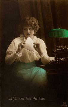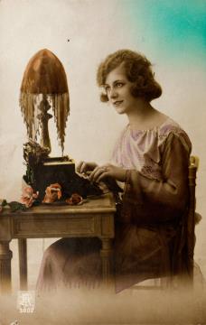 Illustrierte Postkarte; Fotografie, koloriert; Serie 3002 Rückseite: Frau mit Schreibmaschine, Blick zum Betrachter, Tischlampe als Dekoration Vorderseite: beschrieben; Poststempel 1923