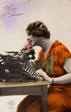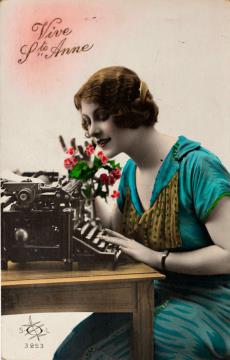 Illustrierte Postkarte; Fotografie, koloriert; Serie SOL 3253 Rückseite: Frau mit Schreibmaschine, Blumen als Dekoration Vorderseite beschrieben
