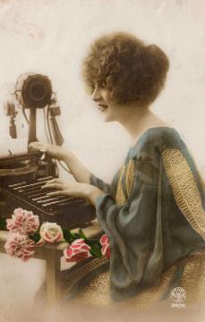 Illustrierte Postkarte; Fotografie, koloriert; Serie A. Noyer 3404 Rückseite: Frau mit Schreibmaschine und Telefon Vorderseite: beschrieben und adressiert; Briefmarke Postes Belgique 5c+5c; Poststempel Vilvorde/17 II 19x3