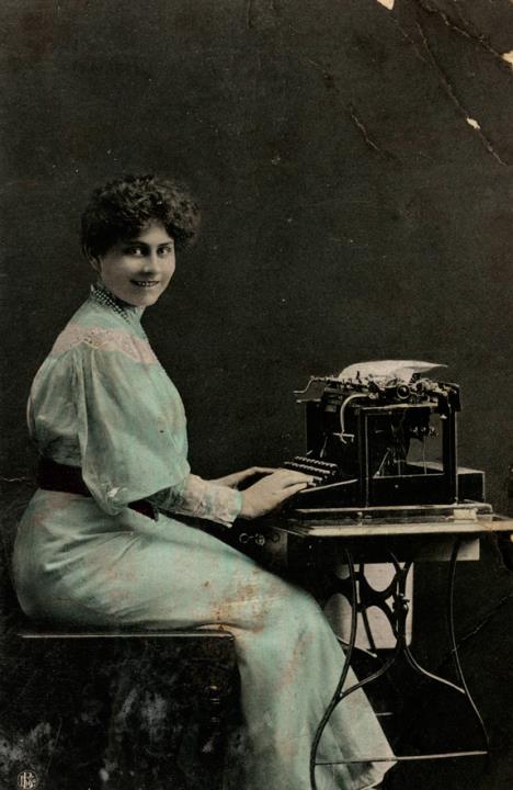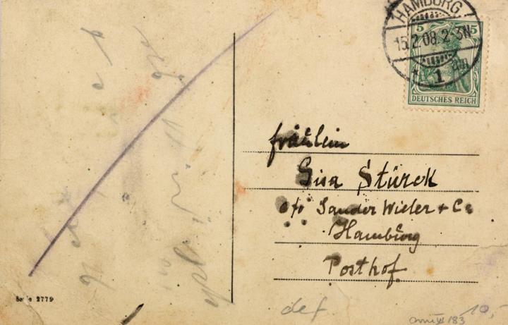 Illustrierte Postkarte; Fotografie, koloriert; Serie 2779 Rückseite: Frau mit Schreibmaschine, Blick zum Betrachter Vorderseite: beschrieben, adressiert an Fräulein Stürck, Hamburg; Briefmarke Deutsches Reich 5 Pf.; Poststempel Hamburg/15.2.1908