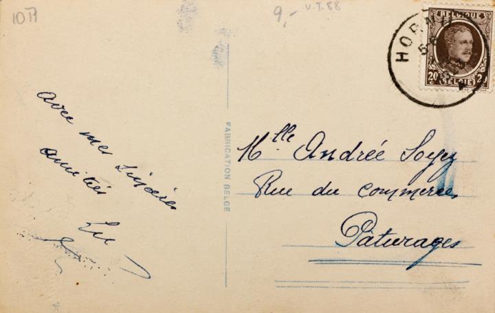 Illustrierte Postkarte; Fotografie, koloriert; Serie 3002 Rückseite: Frau mit Schreibmaschine, Tischlampe als Dekoration Vorderseite: beschrieben; adressiert an M.lle Soyez, Pâturages; Briefmarke Postes Belgique 20c; Poststempel Hornu/2x IV 1923