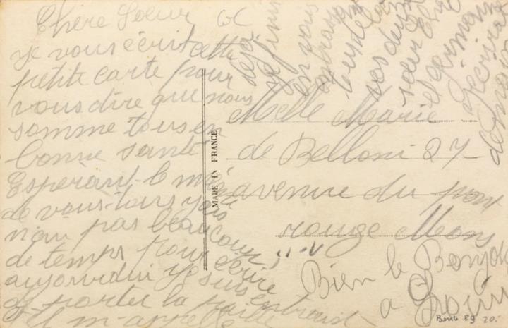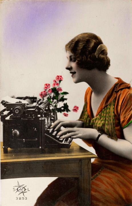 Illustrierte Postkarte; Fotografie, koloriert; Serie SOL 3253 Rückseite: Frau mit Schreibmaschine, Blumen als Dekoration Vorderseite beschrieben