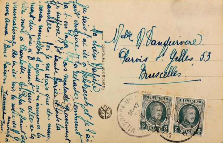Illustrierte Postkarte; Fotografie, koloriert; Serie A. Noyer 3404 Rückseite: Frau mit Schreibmaschine und Telefon Vorderseite: beschrieben und adressiert; Briefmarke Postes Belgique 5c+5c; Poststempel Vilvorde/17 II 19x3