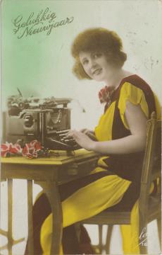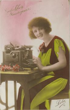 Illustrierte Postkarte (Glückliches Neujahr); Fotografie, koloriert; Serie Lola 16 Rückseite: Frau mit Schreibmaschine, Blick zum Betrachter, Blumen als Dekoration Vorderseite: beschrieben; adressiert an Mejj v. derLaan, Rotterdam; Briefmarke Niederlande 1 1/2 Cent; Poststempel unleserlich