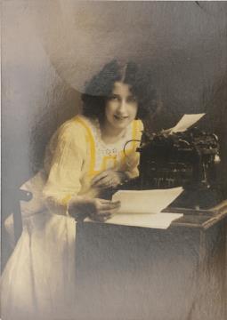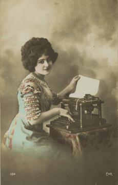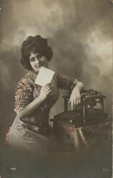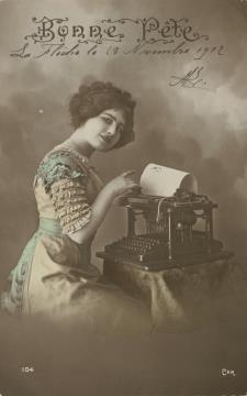 Illustrierte Postkarte; Fotografie, koloriert; Serie 104 CAR Rückseite: Frau mit Schreibmaschine, Blick zum Betrachter Vorderseite: beschrieben; datiert 16-7-12, adressiert an M.elle Alloin, Marcinelle; Briefmarke Postes Belgique 5 c; Poststempel Haine St. Pierre 17 VII 12 / Charleroy 17 VII 1912