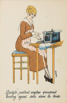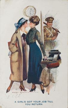 Illustrierte Postkarte; Grafik, polychrom; Brightside Series Nr. 143; Grafik: Fred Spurgin Rückseite: Büroszene(?) mit Schreibmaschine; zwei Frauen als Paar, Soldat blickt in den Raum Vorderseite: beschrieben; adressiert an H.C Liddicoax, Exeter; Briefmarke Postage Revenue (U.K.) Half Penny, Poststempel Devonport/Feb 22 1917