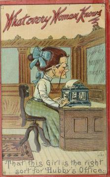 Illustrierte Postkarte; Grafik, polychrom; Serie Nr. 82 Rückseite: alte Sekretärin mit Schreibmaschine; weiterer Text: That this Girl ist the right sort for Hubby's Office. Vorderseite: beschrieben; adressiert an Miss Sprague, Bayside Maine; Briefmarke U.S. Postage 1 Cent; Poststempel Bangore/Jul 27 1913
