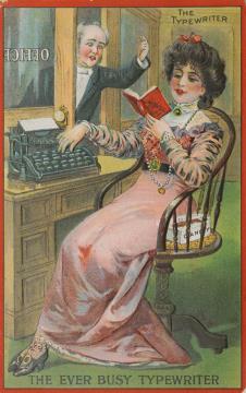 Illustrierte Postkarte; Grafik, polychrom; Nr. S115 Rückseite: Büroszene; Sekretärin mit Schreibmaschine und Buchroman, Vorgesetzter betritt das Büro Vorderseite: beschrieben; adressiert an Miss Meikel, Macungie; Briefmarke U.S. Postage 1 Cent, Poststempel Maxatawny/Jul 12 1912