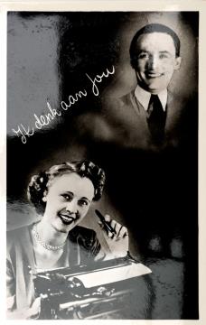 Illustrierte Postkarte; Fotocollage, monochrom; Nr. 252 Rückseite: Frau mit Schreibmaschine und Schreibfeder, darüber Brustbild eines Mannes Vorderseite nicht beschrieben