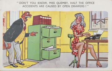 Illustrierte Postkarte; Grafik, polychrom; Nr. 158 Rückseite: Büroszene; Sekretärin in kurzem Kleid mit Schreibmaschine, Vorgesetzter betritt das Büro; weiterer Text: [...] half the office accidents are caused by open drawers! Vorderseite: beschrieben; adressiert an Mrs. Simmons, London; Briefmarke Postage Revenue (U.K.) 1d., Poststempel Bromley Beckenham/11 Jly 1956