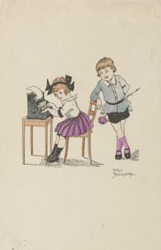Illustrierte Postkarte; Fotografie, koloriert; Serie 38 Zita Rückseite: Junge und Mädchen mit Schreibmaschine, Blick zum Betrachter, Blumen als Dekoration Vorderseite: beschrieben; adressiert an Miss Westall, London; Briefmarke Postes Francaises 10c; Poststempel 22 - 12 13