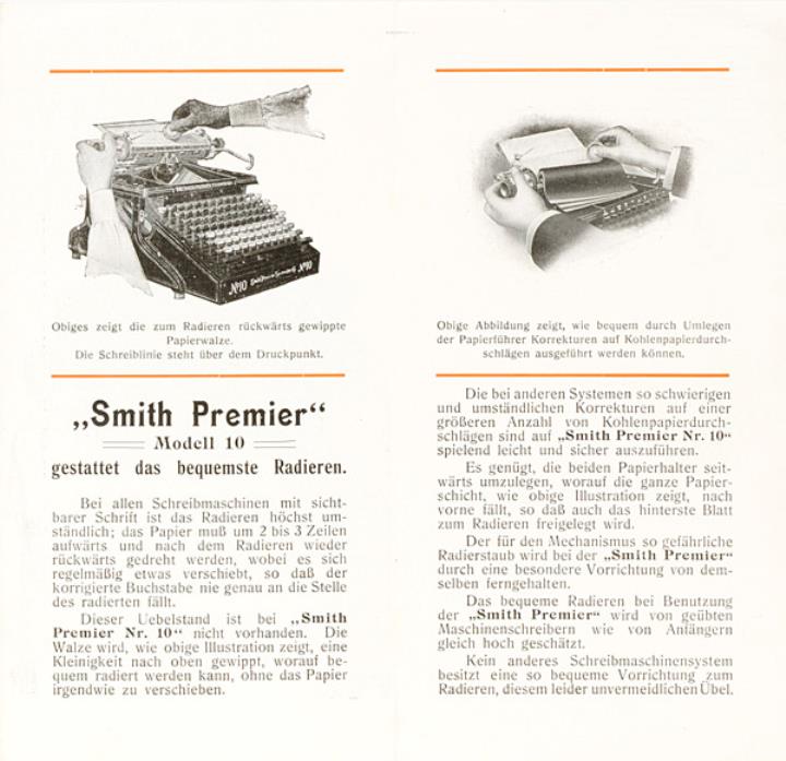 Faltprospekt für Schreibmaschine Smith Premier 10 Nr. H.9. mit handschriftlichem Vermerk