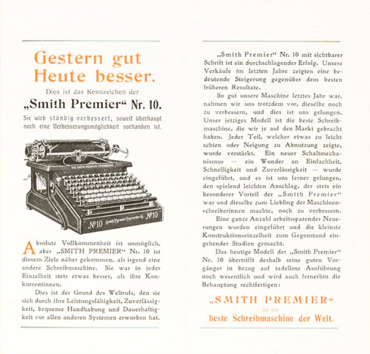 Faltprospekt für Schreibmaschine Smith Premier 10 Nr. H.6. mit handschriftlichem Vermerk