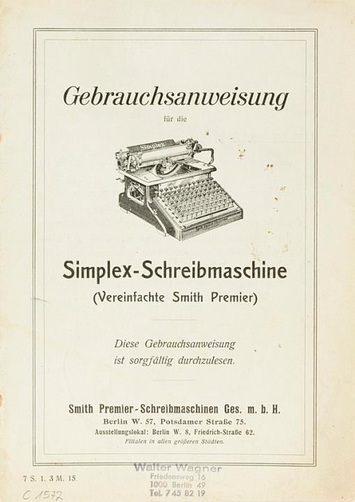 Bedienungsanleitung für Schreibmaschine Simplex (vereinfachte Smith Premier) Nr. 7S.1.3M.15.