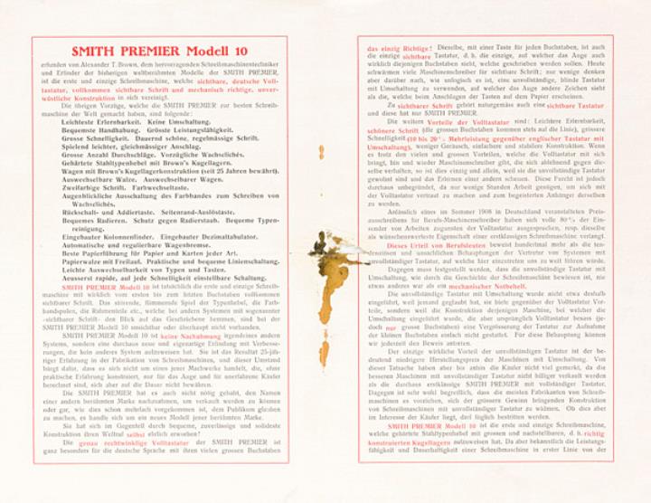 Faltprospekt für Schreibmaschine Smith Premier 10 die erste und einzige Schreibmaschine mit vollkommen sichtbarer Schrift