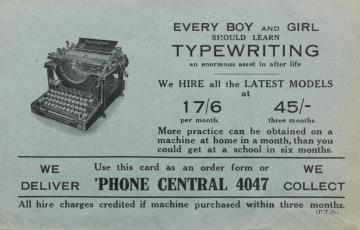 Werbepostkarte; Grafik, monochrom Rückseite: Remington Schreibmaschine mit Informationstext zu Schreibmaschinenverleih Vorderseite: vorgedruckte Anschrift Re-Manufactured Typewriters Ltd., London; vorgedruckter Bestelltext