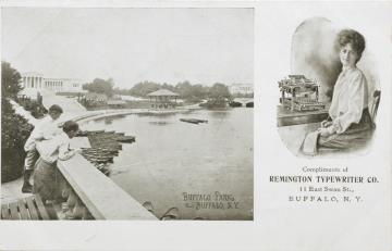 Werbepostkarte; Fotocollage, monochrom Rückseite: Ansicht des Buffalo Park - Buffalo, N.Y.; Frau/Sekretärin mit Schreibmaschine Remington Vorderseite nicht beschrieben