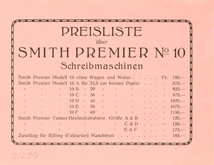 Preisliste über Smith Premier N° 10 Schreibmaschinen