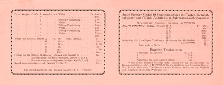 Faltprospekt mit Preisliste für Schreibmaschine Smith Premier 10