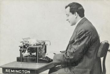 Illustrierte Postkarte mit Autogramm; Fotografie, monochrom Rückseite: Mann mit Schreibmaschine Remington; handschriftliche Widmung "Yours truly, Ernest G. Wiese" (Anm.: Miterfinder der Blindschreibmethode) Vorderseite nicht beschrieben
