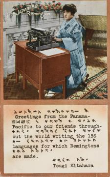 Werbepostkarte; Fotografie, koloriert; Rückseite: asiatische Frau in traditionell japanischem Gewand mit Schreibmaschine Remington; Text zweisprachig Vorderseite mit Beschreibung: Remington Typewriter Company Exhibit, Palace of Liberal Arts, Panama-Pacific International Exposition, San Francisco, 1915