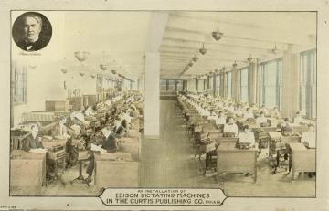 Illustrierte Postkarte; Fotografie, koloriert; Nr. 2189 Rückseite: Ansicht eines Großraum-Schreibbüros der Curtis Publishing Company, Philadelphia; männliche Mitarbeiter mit Diktiermaschinen links, weibliche Mitarbeiter mit Schreibmaschinen rechts; linke obere Ecke mit Edison-Porträt Vorderseite: vorgedrucktes Medaillon mit Edison-Porträt; nicht beschrieben