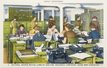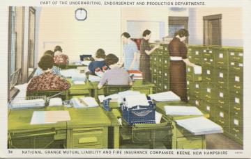 Illustrierte Postkarte; Grafik, polychrom; Nr. 64392 Rückseite: Büroansicht; Sekretärinnen mit Schreibmaschine, weiterer Text: National Grange Mutual Liability and Fire Insurance Companies, Keene, New Hampshire Vorderseite: Werbetext; nicht beschrieben