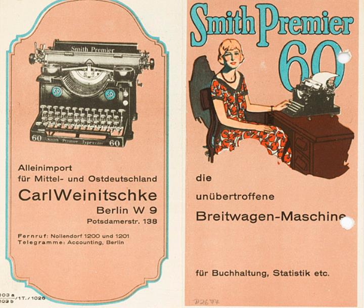 Next to literature on the history of technology, of the typewriter and the office, the Archive holds patent letters, textbooks and instruction manuals as well as historical postcards, letters, photographs and various kinds of advertising (leaflets and brochures, advertising stamps, newspaper ads, posters and signs, promotional gifts).