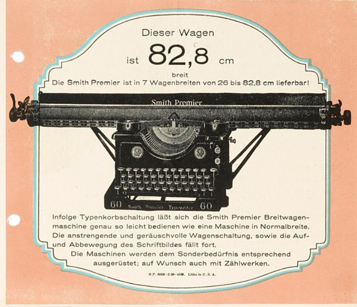 Faltprospekt für Schreibmaschine Smith Premier 60 die unübertroffene Breitwagen-Maschine für Buchhaltung, Statistik etc. Nr. 103a/103b/1T./1026