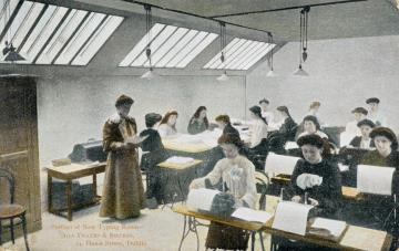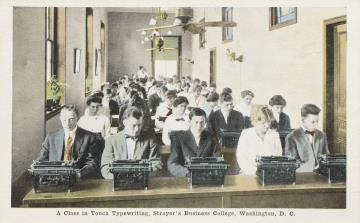 Illustrierte Postkarte; Fotografie, koloriert Rückseite: Schreibmaschinenraum des Strayer's Business College, Washington D.C.; Männer und Frauen mit Schreibmaschine Vorderseite: vorgedruckter Werbetext; nicht beschrieben