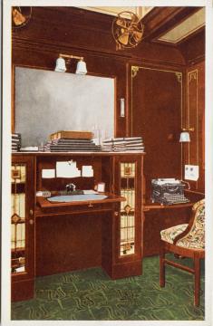 Illustrierte Postkarte; Fotografie, polychrom Rückseite: Aussichtssalon der Overland Limited Eisenbahn; Schreibmöbel mit Schreibmaschine Vorderseite mit Informationstext; nicht beschrieben