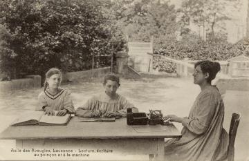 Illustrierte Postkarte; Fotografie, monochrom Rückseite: Aufnahme im Freien eines Blindenheims; Frau und zwei Kinder mit Buch, Braille-Schablone und Blindenschreibmaschine; weiterer Text: Lecture, écriture au poinçon et à la machine Vorderseite: beschrieben; adressiert an Miss Darves, Vevey-la-Tour; Poststempel unleserlich