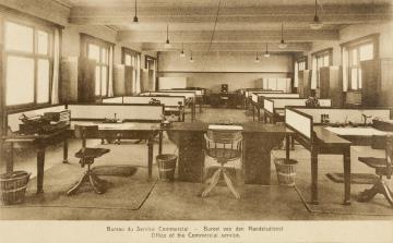 Illustrierte Postkarte; Fotografie, monochrom Rückseite: Büroansicht mit Schreibtischen und Schreibmaschine Vorderseite mit Beschreibungstext: Société Anonyme "Flandria" [...] Belgique; nicht beschrieben